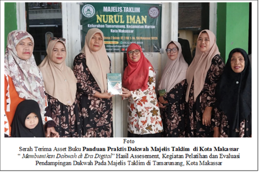 Dari program Pendampingan Dakwah bagi Majelis Taklim di kelaurahan Tamarunang ini, disamping berhasil membentuk visi, misi, struktur dan SOP Majelis Taklim Nurul Iman Tamarunang, juga berhasil diterbikan buku panduan dakwah bagi Majelis Taklim di kota Makassar. Buku ini diberi judul “Membumikan Dakwah Di Era Digital: Mengintegrasikan Kearifan Lokal Dan Teknologi, Panduan Dakwah Majelis Taklim Makassar”. Buku ini juga sekaligus sebagai salah satu aset sangat penting Majelis Taklim pengelolaan dan pengembangan dakwah bagi Majelis Taklim di kota Makassar ke depan dengan tantangan komunikasi berbasis digital dan kearifan lokal di Sulawesi Selatan.