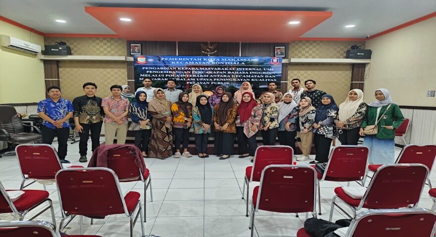 Dalam rangka meningkatkan kualitas pelayanan publik di Kecamatan Bontoala, tim Pengabdian kepada Masyarakat (PKM) melaksanakan pelatihan bertajuk “Pengembangan Percakapan Bahasa Inggris Melalui Pola Interaksi antara Staf Kecamatan dan Masyarakat dalam Upaya Peningkatan Kualitas Pelayanan Publik.” Kegiatan ini dilaksanakan 01 Oktober 2024 di Kantor Kecamatan Bontoala, Makassar bertujuan untuk memperkuat kemampuan percakapan bahasa Inggris staf kecamatan sehingga lebih siap menghadapi interaksi dengan masyarakat, terutama dalam situasi yang melibatkan warga atau tamu dari luar negeri.